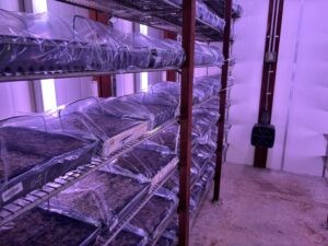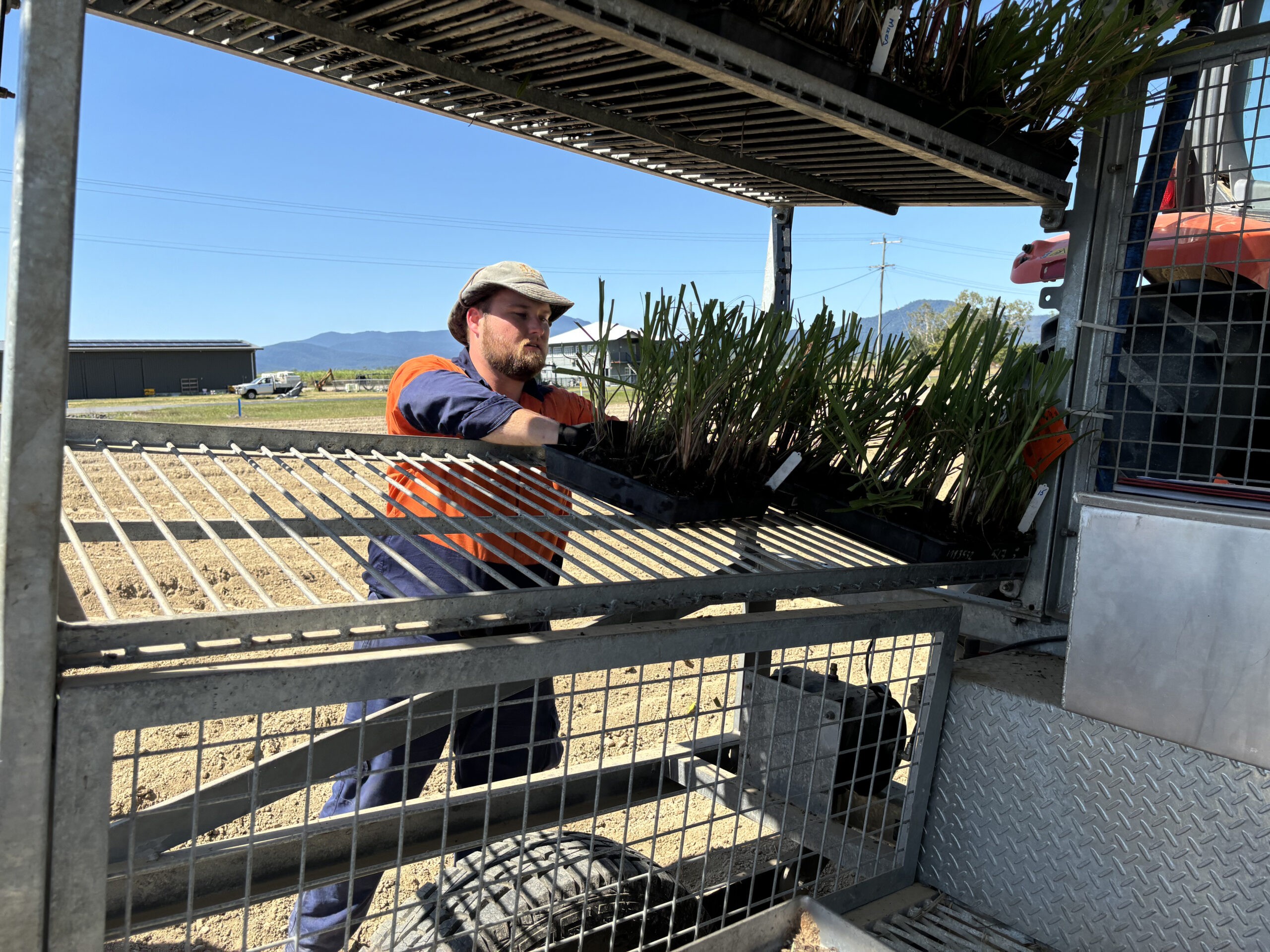 Each year, seed selected from the most recent crossing efforts are germinated in the Meringa, Ingham, Burdekin and Mackay stations to produce starting populations for the Northern and Herbert (Meringa), Introgression (Ingham), Burdekin (Ayr), and the Central, Southern and New South Wales selection programs, respectively. Sugarcane seed (also known as fuzz) are spread onto the surface of trays of seedling raising mix, sprayed with a fungicide and watered in where they are then covered in plastic to create a warm moist microclimate in a germination chamber at approximately 32 degrees Celsius for a minimum of two days. This creates the ideal conditions for sugarcane seed to germinate. After two days the seed has germinated, and the trays of germinated seedlings are then moved to the glasshouse where they continue to grow and harden. After four weeks’ growth the seedlings are large enough to transplant into bigger trays as family groups and are moved to the seedling rearing benches outdoors to continue to harden. This means that each tray of seedlings represents 20 siblings from the same female by male cross combination, that is, they are all brothers and sisters who share common parents but are all genetically different. The number of trays per family transplanted depends on whether it is a proven family or not. Once out on the benches, the seedlings are watered three to four times a day, and excess leaf material is trimmed once a week to harden the seedlings and promote tillering.