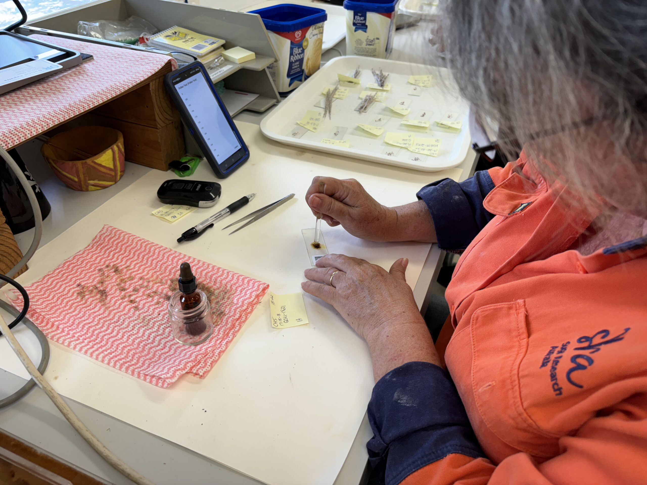 Florets from the flowers of selected parents are brought back to the laboratory at Meringa Station to determine if the parent will be used as a male or female. This is determined by how much viable pollen a flower produces. To do this, anthers containing pollen are extracted from the florets and placed onto slides where the anthers are squashed to release the pollen. A basic starch test using a drop of potassium iodide is then conducted on the pollen grains. An assessment of the percentage of viable pollen present under a microscope is used to determine the gender. A parent that produces more than 20 percent viable pollen is considered a male, and any less it is used as a female. This process is conducted each time a crossing session is carried out at the station, as pollen viability is sensitive to nocturnal temperatures, and male sterility is often experienced when night-time temperatures drop below 18 degrees Celsius. These changes in pollen viability often results in some parents being used as both a male and a female at different times during a crossing season.