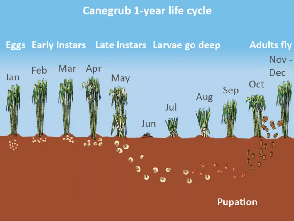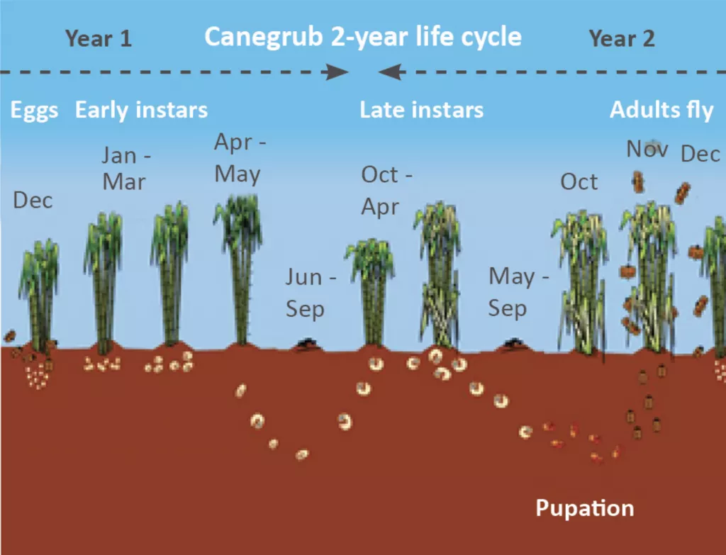 One-year cycle canegrubs complete their lifecycle within twelve months, as per the generalised lifecycle below.